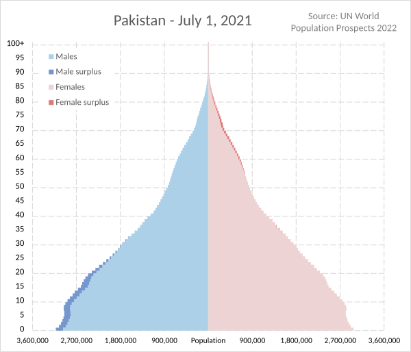 Пакистан, одна из беднейших стран мира, имеет один из самых высоких темпов прироста населения в мире, который составляет около 3,0% в год. За более чем 2 десятилетия средняя женщина в Пакистане родила более 6 детей. При нынешнем коэффициенте рождаемости нынешнее население страны, составляющее 120 миллионов человек, к 2000 году увеличится до более чем 150 миллионов, а к 2020 году — до 280 миллионов. все равно достигнет 160 миллионов, прежде чем выровняется. Но снизить рождаемость в Пакистане будет непросто. Одним из ведущих препятствий является низкий статус женщин. Немногие женщины в Пакистане имеют высшее образование или профессиональную работу. Только 1/4 женщин без образования или неработающих имеют какие-либо знания о контрацепции. Размер и состав семьи также способствуют высокому уровню рождаемости. В среднем женщины желают иметь 5 детей (тот факт, что женщины в среднем рожают более 5 детей, свидетельствует о неудовлетворенной потребности в противозачаточных средствах). А из-за социальных, культурных и экономических условий пакистанцы обычно предпочитают потомство мужского пола.