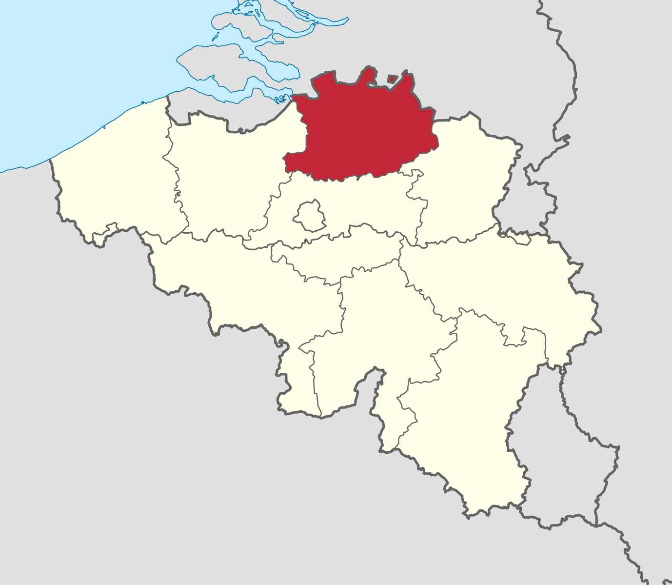 Бельгия делится на фламандскую и валлонскую части. Валлонская часть отмечена желтым, фламандская — красным, а столица Брюссель — синим.