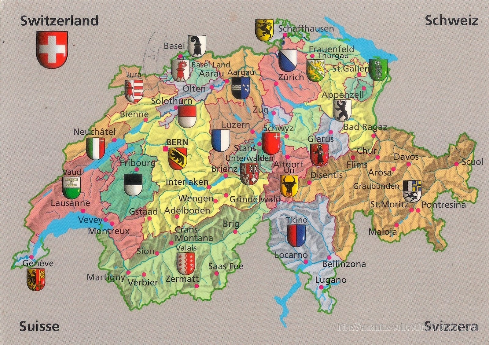 Швейцария — государство в Западной Европе. Ее официальное название — Швейцарская Конфедерация. Оно происходит от кантона Швиц — одного из первых, образовавших союз. Страна и в наши дни сохраняет конфедеративное устройство и состоит из 26 кантонов (шесть из них имеют статус полукантона). По своему географическому местоположению они образуют несколько районов.