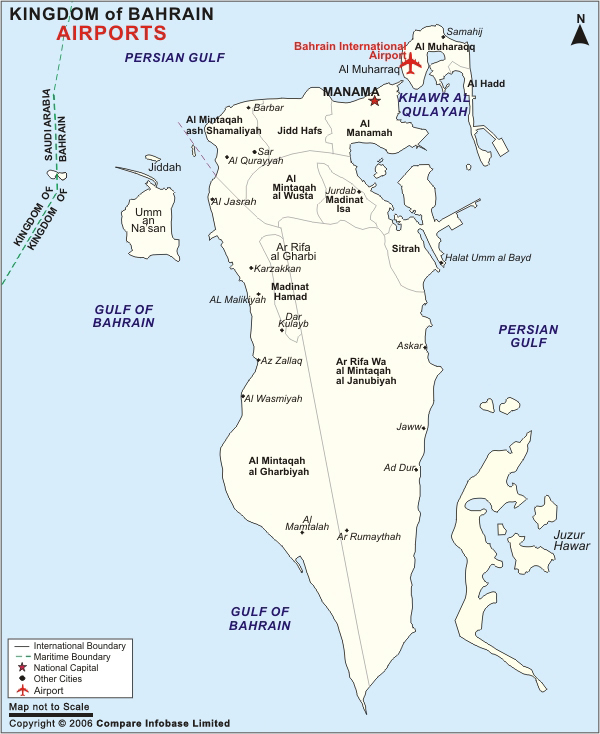 Столицей государства является город Манама. На карте город располагается на северо-восточном побережье острова Бахрейн (Bahrain).
