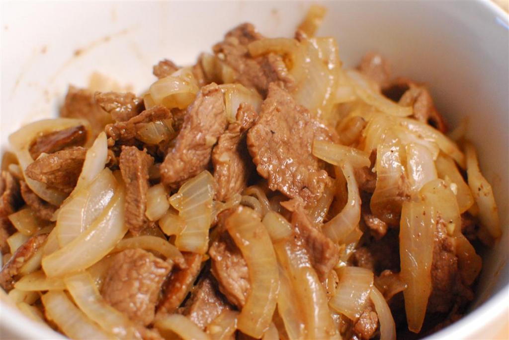 л масла на сред. огне. Обжаривать говядину примерно 5-7 мин. Желательно жарить мясо маленькими порциями. Мясо выложить на тарелку поставить в сторону.