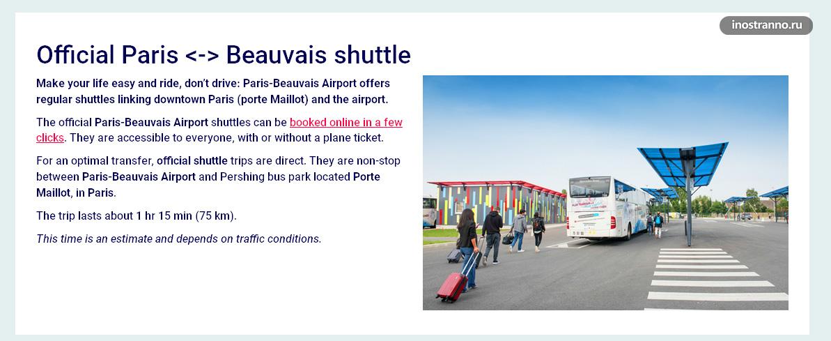 Автобус Navette Beauvais связывает аэропорт Бове с Парижем, станцией метро Porte Maillot (это первая ветка метро). На плане парковок выше указано, где он останавливается (между первым и вторым терминалом, вы не промахнетесь — автобус останавливается на выходе из аэропорта).