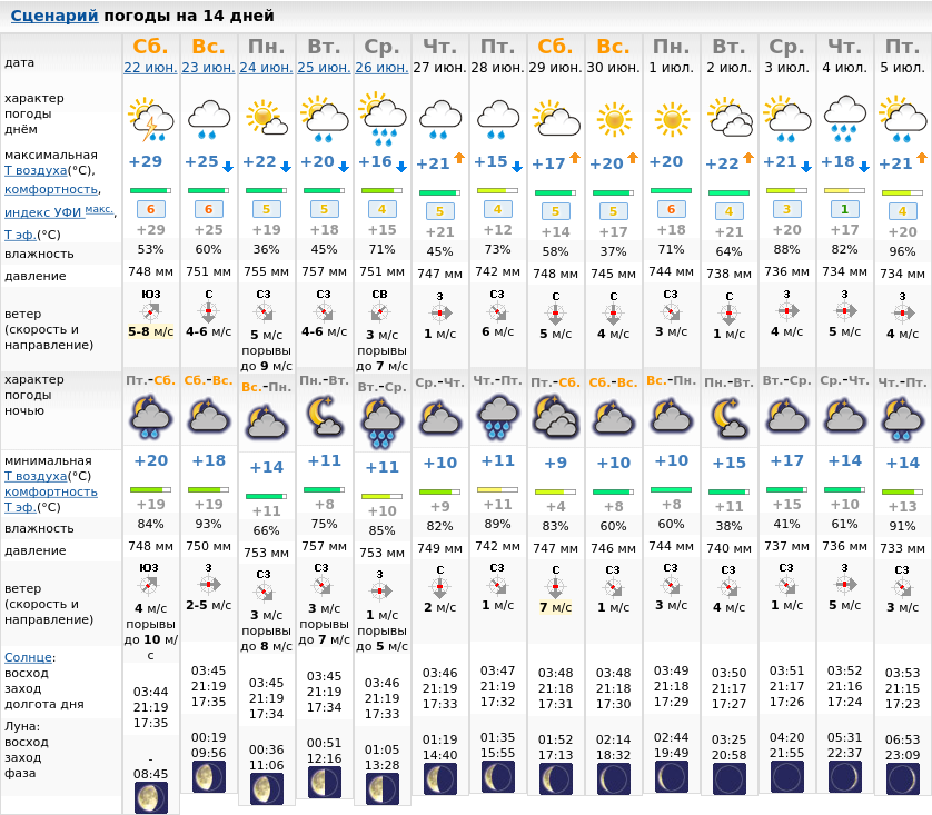 Взгляните на семидневный прогноз погоды для основных городов Москвы и средней полосы России.Для каждого пункта назначения погодный инструмент Easyvoyage дает индикаторы температуры и осадков, а также силу и направление ветра, а также время восхода / захода солнца. Подготовьте свой отпуск, используя наши прогнозы погоды, или организуйте свои мероприятия благодаря индексу комфорта погоды для Москвы и средней полосы России. Готовитесь ли вы к поездке или уже в отпуске, никогда не было проще следить за погодой, чем с Easyvoyage!