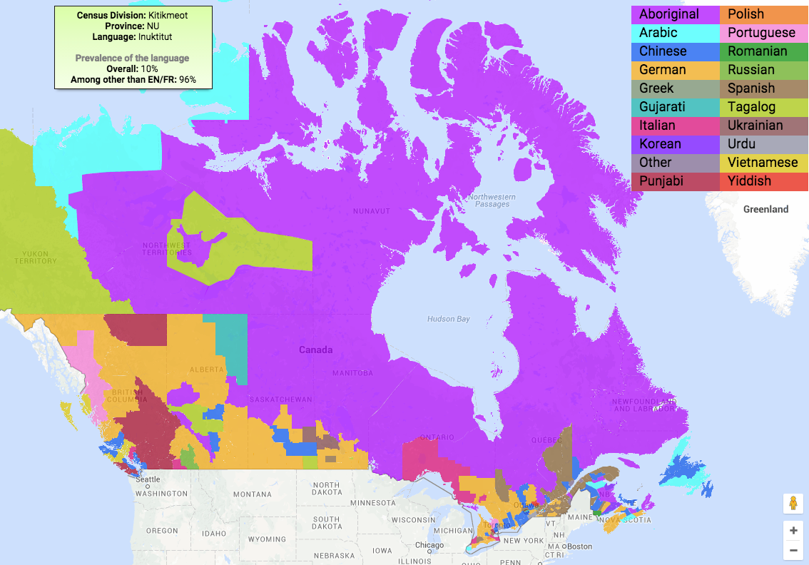 Таким образом, большинство двуязычных канадцев проживает в Квебеке, хотя большинство населения провинции одноязычно.